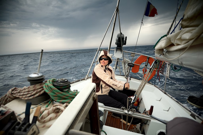 e grands bords plutôt au près serré. La mer est assez agitée et le ciel s'assombrit vite. Le coupe-vent n'est alors pas un luxe. Grégal se comporte dignement, et fend les flots sur une gîte modérée. Nous ne sommes que deux voiliers, qui, dans le coin, nous prenons à aller nez au vent. Tom, qui a l'esprit de compétition, s'improvise une mini-régate. Et en effet, nous parvenons grâce à un réglage des voiles très pointu ;) à dépasser l'autre voilier, pourtant plus gros. Un autre évènement vient ponctuer notre course. En quittant le Frioul, nous avions sorti notre fière canne à pêche de compétition avec au bout un tout petit rappala qui nous avait été laissé par l'ancien propriétaire. A peine dix minute plus tard, un poisson avait mordu ! C'est ainsi que nous avons pêche notre première prise : un beau maquereau (nous présumons, après identification sur planches) de 45 cm (mesuré au millimètre, s'il vous plaît). Nous l'avons religieusement enroulé dans un plasti