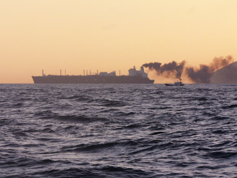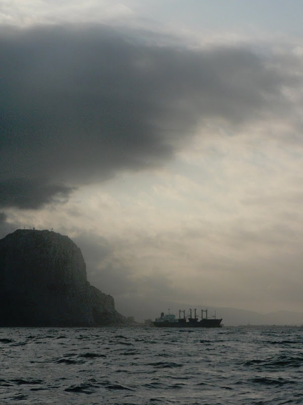 Il est 19h30, le ciel s’est assombri. Le Rocher, entouré de cargos à l’arrêt, se découpe sur des cumulus noirs. La mer est anarchique et fortement houleuse, il fait froid et l’humidité de l’air imprègne tout.