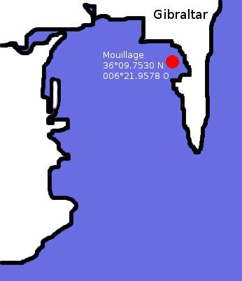 Pour faciliter la vie à d’autres aventuriers qui auraient la bonne idée d’arriver à Gibraltar de nuit, nous joignons ici une petite carte indiquant où l’on peut mouiller.