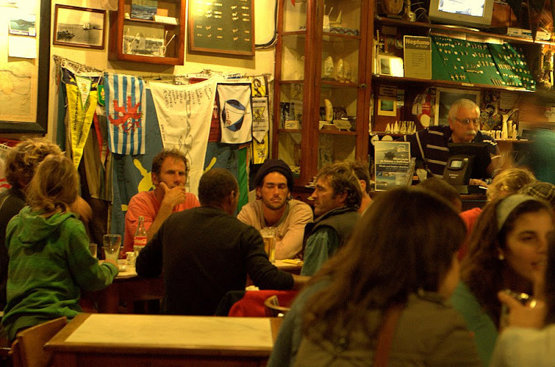 On l'a dit, Chez Peter, le Café des Sports, est une institution à Horta. Point de ralliement post-traversée de l'Atlantique, lieu de rendez-vous oblige de tous les marins dès que le soir tombe, son ambiance bigarrée et déjantée promet à chaque fois de belles soirées (et des rencontres pas tristes !) en perspective. Voici quelques clichés, pour célébrer ce lieu mythique (NB : il y en a une chez Kiss Mi, cherchez l'erreur !)