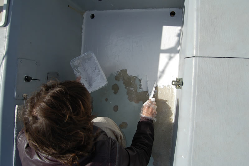 Après trois weekends consécutifs de lutte contre le vieux revêtement de sol du cockpit, nous voilà prêts à appliquer une belle couche de gel coat à la spatule... C'est le premier c…