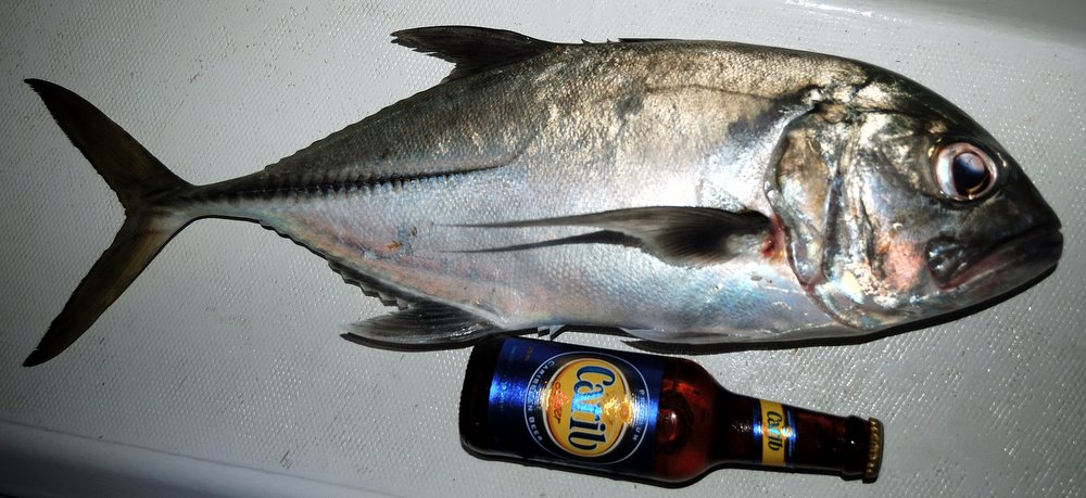 Sinon hier on a pêché un beau spécimen, une carangue à gros yeux (horse eye jack). Il n'en reste pas moins délicieux malgré sa drôle de gueule.