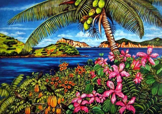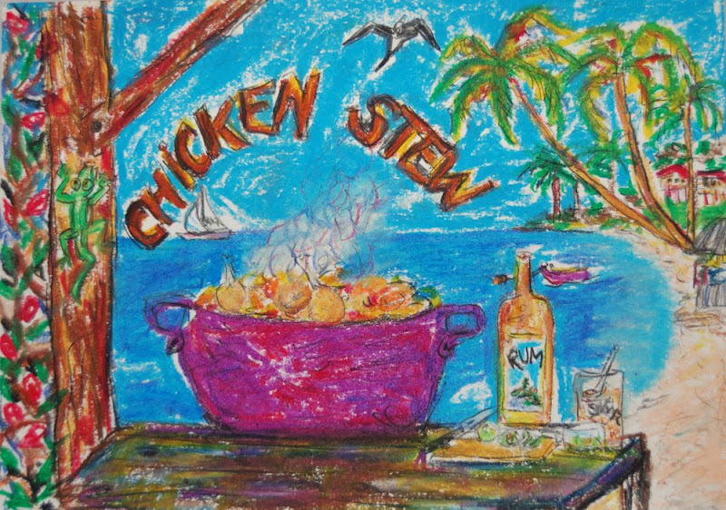 Cette peinture n'est pas de moi :) elle est de l'artiste Pinky Vaughan-Richards, qui vit à Bequia. Voici pour aujourd'hui un plat relevé qui peut être réalisé avec du poisson, du p…
